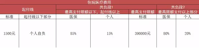 首先自负1500元的起付线费用,超过起付线的费用可以由医疗保险按比例报销。如果超过较好支付限额的部分,还可以由附加基金按比例支付。