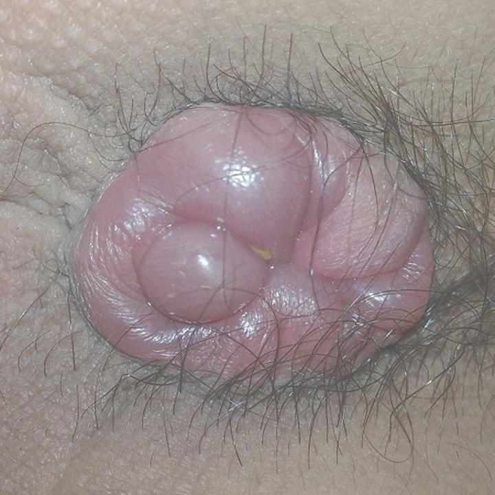 结缔组织型外痔:肛门缘皮肤皱襞变大,肛门口出现可以摸到的肉球肉团。 查看图片