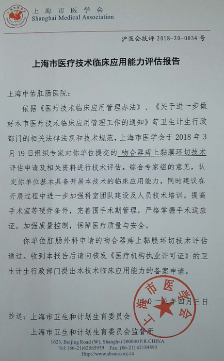 经过严谨的考察评估,综合医学会专家组的意见,上海市医学会认定上海中佑肛肠医院具备开展PPH技术的临床应用能力,并于4月3日下发了评估报告。