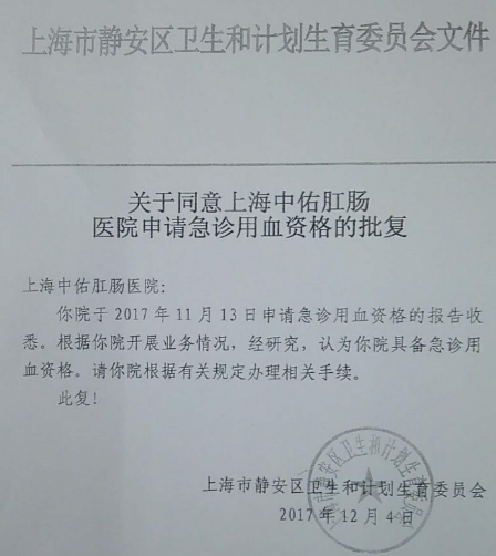 ①临床用血挂靠。为向人民群众提供更加安全、有效、便捷的医疗服务,上海中佑肛肠医院经静安区血液事务管理中心及市临床输血质控中心同意,临床用血将挂靠上海市静安区中心医院。